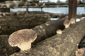原木しいたけの収穫体験ができる。採ったしいたけはグラムで量り売りしている。